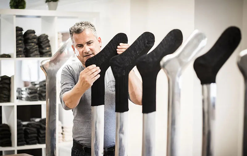 Mit den zwei über 40 Jahre alten Bentley Strickmaschinen werden dabei ausschließlich Socken aus feinster Merinowolle hergestellt. Ein reines Naturprodukt aus einem nachwachsenden Rohstoff, das nicht kratzt und bis zu 30% des eigenen Gewichts an Flüssigkeit aufnehmen kann.